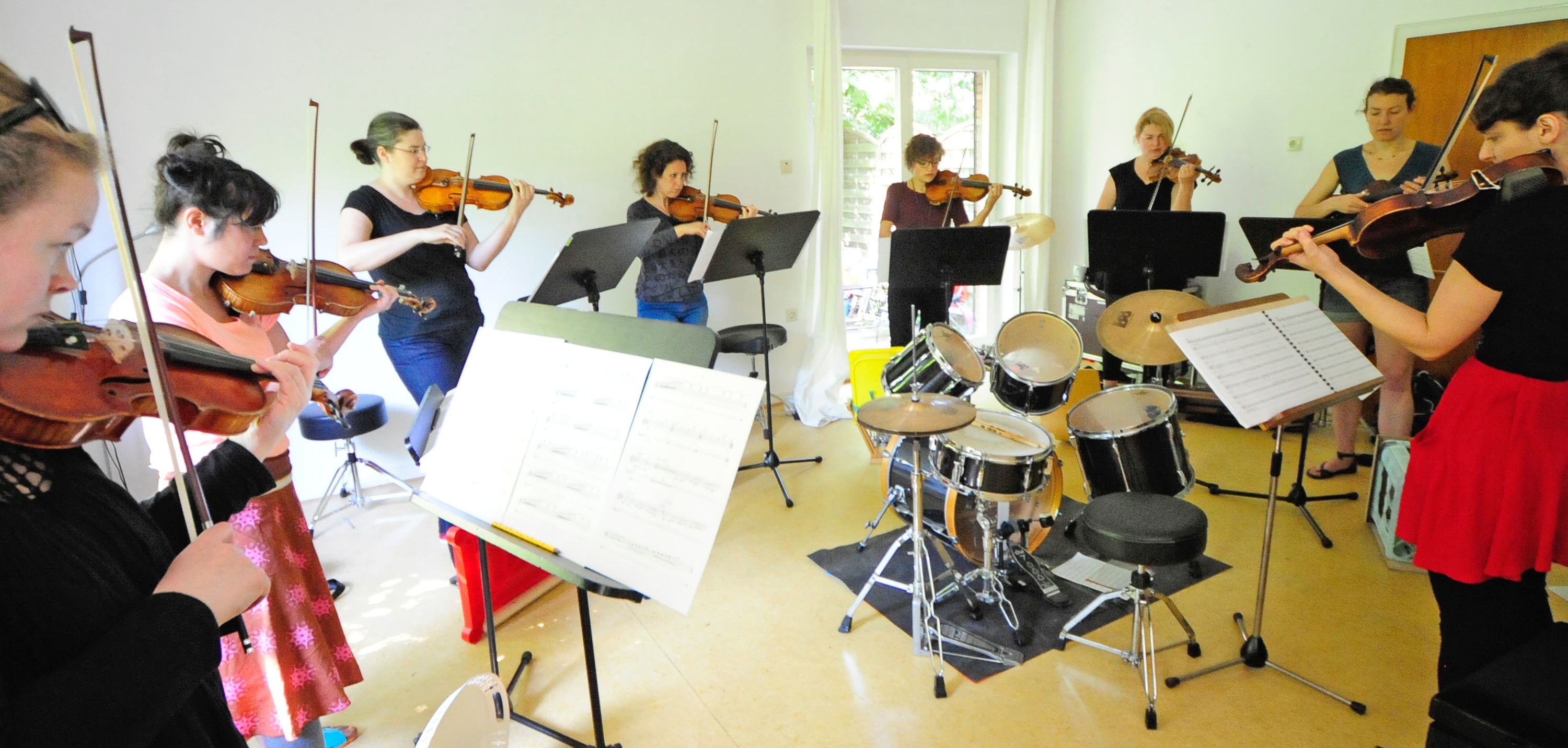4 Tage Probenarbeit, 8 Frauen, 8 Geigen, 7 Perkussionsinstrumente, ein Schlagzeug und unendlich viel Neugier.